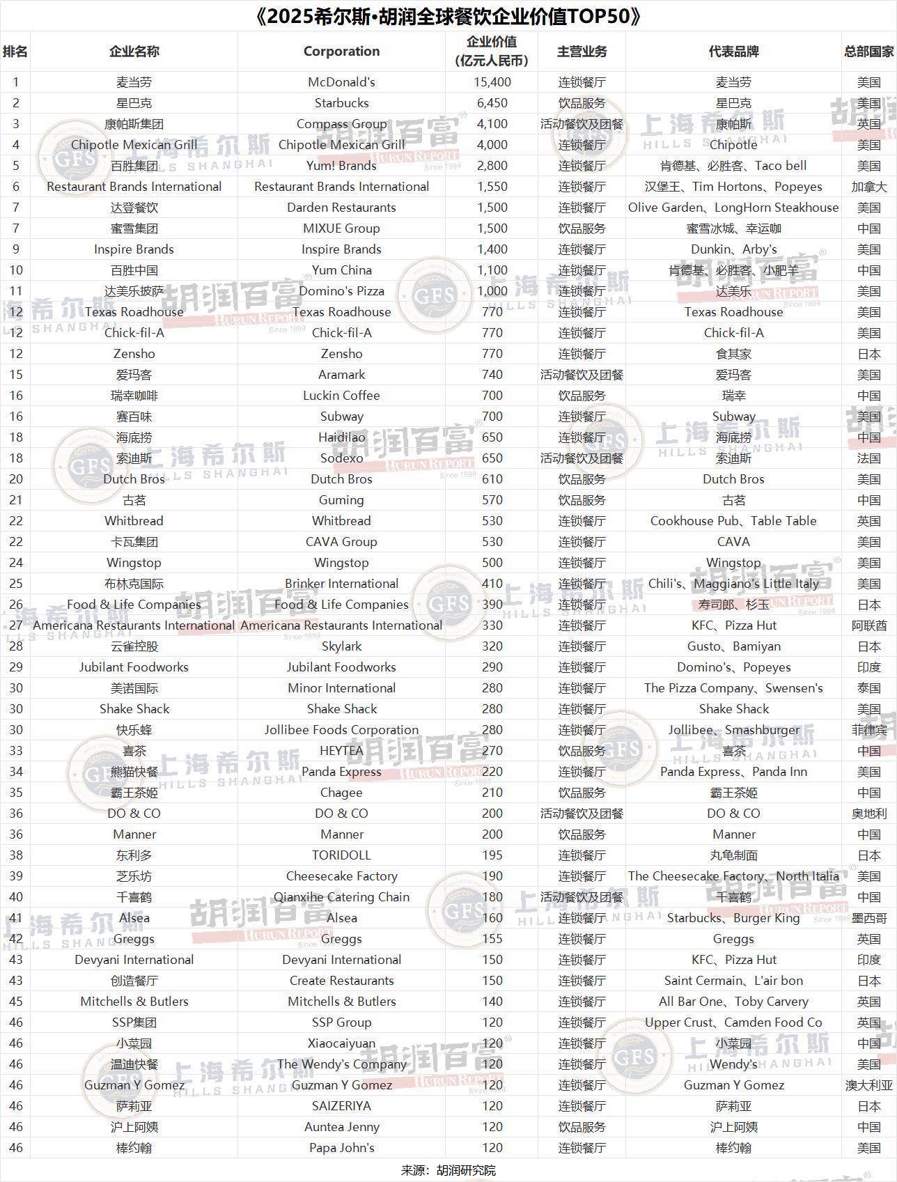 2025希尔斯·胡润全球餐饮企业价值TOP50